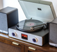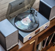 This record player plays 33 1/3 and 45 rpm records on a full-size aluminum platter. It has a brushed aluminum faceplate and a smoked dust cover that can be lowered while a record is playing.